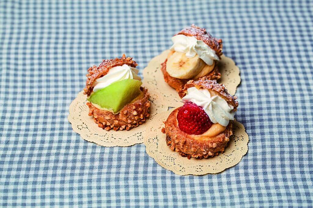 ナッツがちりばめられた香ばしいシューの中に、カスタード、生クリーム、季節のフルーツをサンド。イチゴは柏崎産の越後姫を使用している。