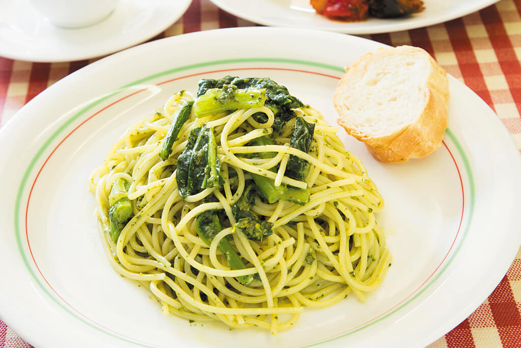 地元・新発田の農園や自家栽培でとれた野菜、県内の漁港で水揚げされた魚介といった地場産の食材にこだわり、四季を感じる料理を提供。冬のイチオシは、佐渡産アオリイカを使ったコク深いスパゲティ。旬を楽しめる日替わりの「本日のランチセット」もぜひ。