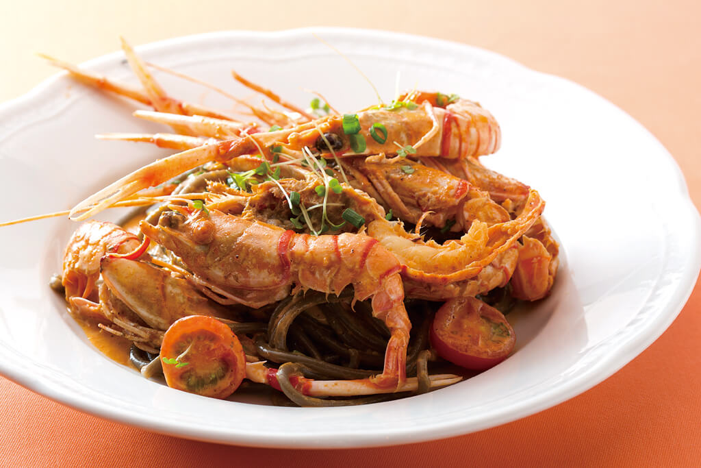 「旅先で訪れたイタリアのレストラン」がコンセプト。ローマの歴史的建造物・コロッセオをイメージした建物は一歩足を踏み入れた瞬間、一気にイタリアへトリップ。現実から少し離れ、旅先で心が解放された気分に浸れる。「現地で実際に食べられている料理をベースに作っています。食材やワインもイタリア直輸入。もちろん、上越産の食材も使いますし、パスタやチーズは自家製です。本場の味を気軽に楽しんでほしいですね」と横井シェフ。こちらのスペシャリテは、定番メニューとして愛されている手長エビのトマトクリームパスタ。手長エビの濃厚な甘み、クリーミーなソース、歯切れのいいタリアテッレが見事に調和。この一皿に会うために、また旅をしたくなる。