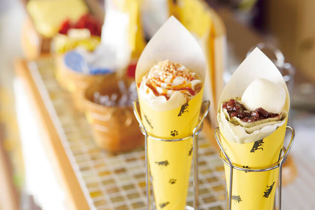 上越妙高駅西口の商店街「フルサット」にあるスイーツカフェ。イチオシは写真右の笹団子クレープ(600円)。ヨモギを練り込んだ風味豊かな生地に、小倉あんを包んだ和風仕上げは、大福アイスのひんやり&モチモチ食感も心地いい。