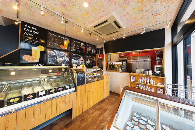 農家が作ったジェラートやスイーツ、くだものを販売。ジェラートはモモやブドウやナシなど地場産食材の味を常時10種類用意し、どれも具沢山。人気のモモは食材の約9割が入り、モモを丸ごと食べているような感覚に。ドリンクにはスムージーもそろえ、秋にはクレープも登場予定。