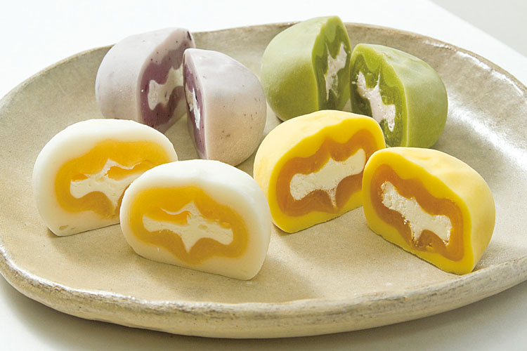 とろけるようなやわらかい餅で生クリームとあんを包んだ3層構造のカラフル仕上げ。味は常時20種類ほどそろう。赤ちゃんの顔が描かれたかわいらしいパッケージも好評。