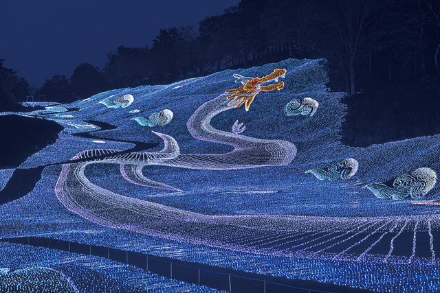 上杉謙信ゆかりの赤色の羅紗に刺繍されている『昇り龍』と『下り龍』が大空を駆け巡る、史上初の『双方向ラウンド(地上絵)イルミネーション』。同地の高台と下台(高低差30m)のビューポイントから双方向に美しい光を放つ巨大な龍の光『昇り龍』『下り龍』が登場。(公式HPより)