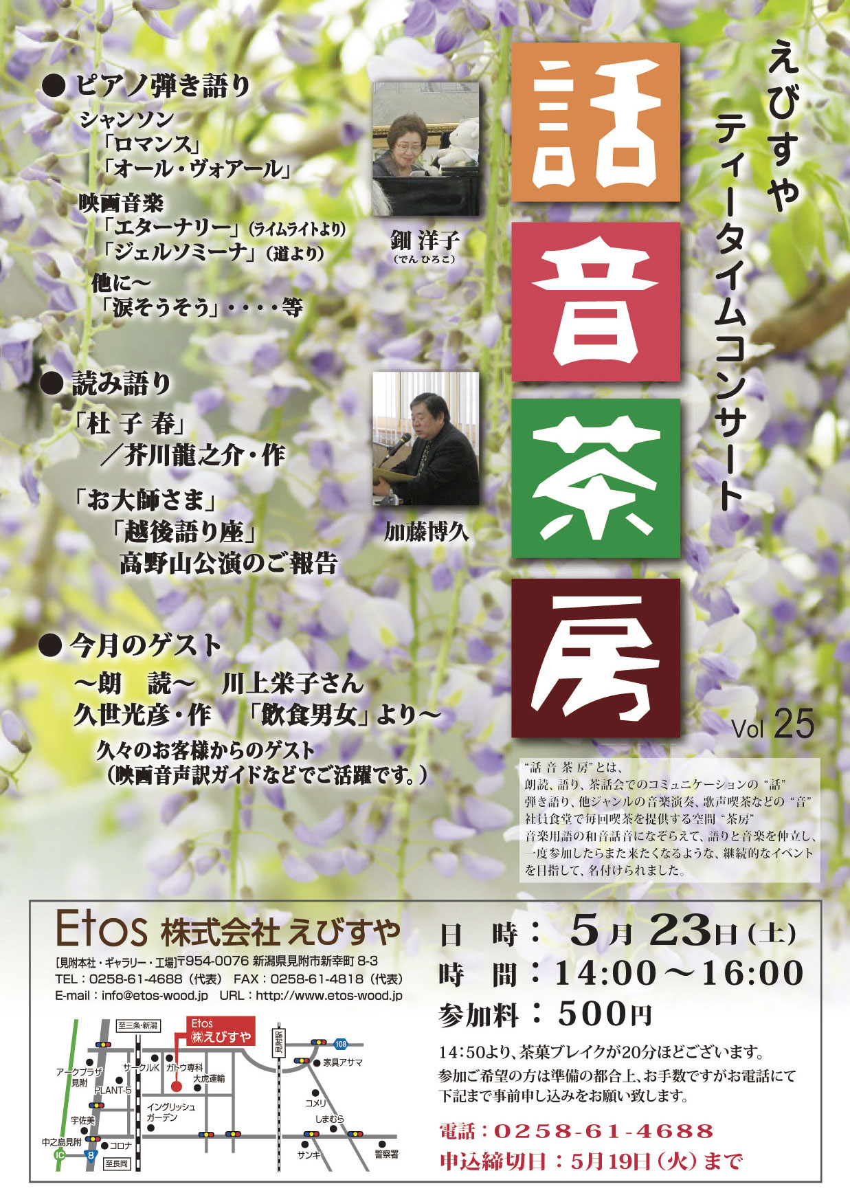 見附市で木製建具、家具、内装材の製造販売をおこなっている、株式会社えびすやでは、5月23日に第25回目の「えびすやティータイムコンサート 話音茶房」を開催いたします。