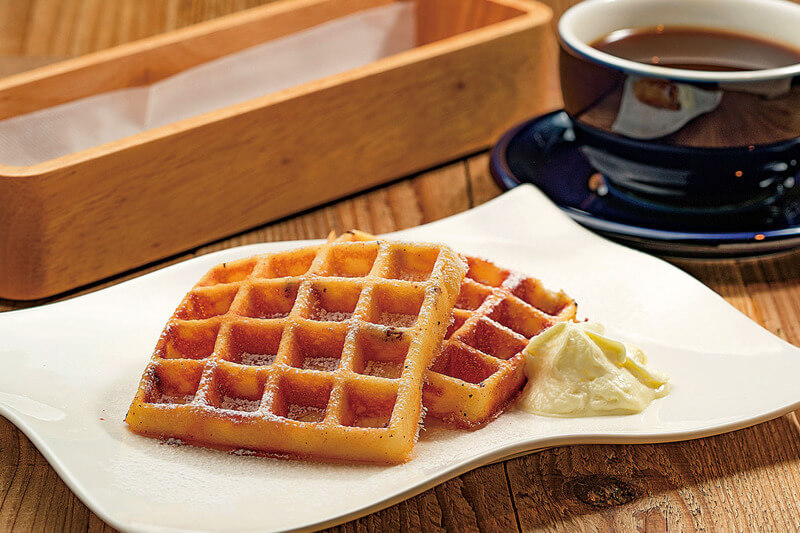 コーヒーと相性抜群の県産米粉を使ったワッフルも自慢