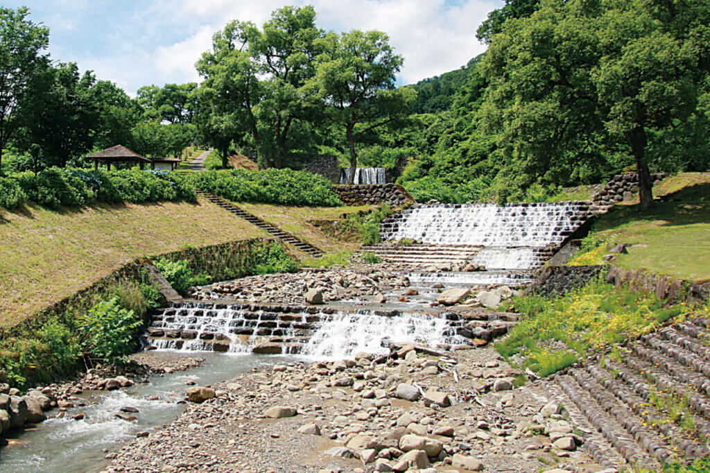 新潟県の砂防発祥の地として歴史的経緯のある万内川に造られた公園。大正10年に施工された石積みは国の有形文化財に。水深は浅く整備され、水遊びする子どもはもちろん、川べりにチェアを置いてくつろぐ大人の姿も。東屋や遊具、バーベキュー施設もあり。美しい森の空気を吸って、川のせせらぎを聞きながらリラックスしましょう。
