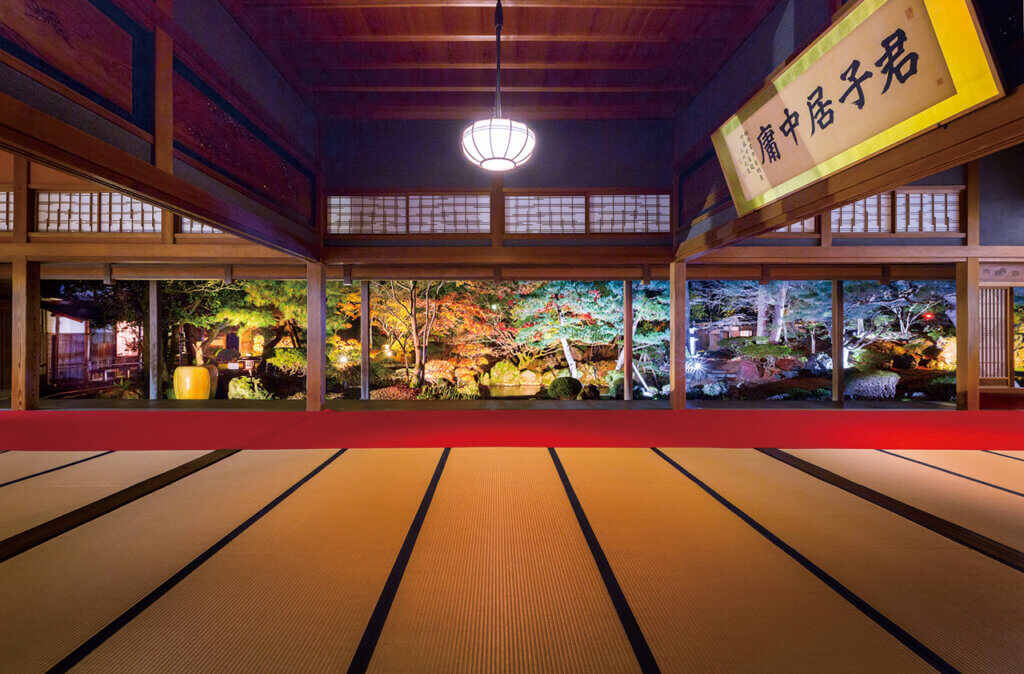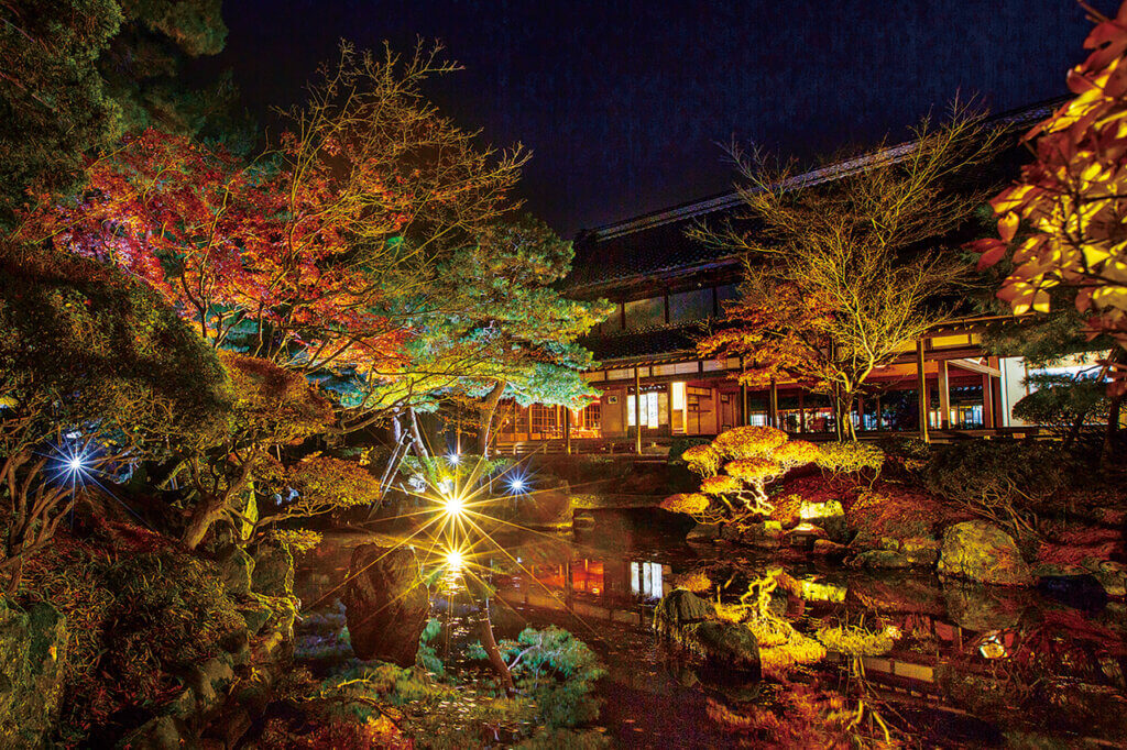 紅葉名所として名高く、毎年多くの観光客が訪れる松雲山荘。夜はライトアップされたモミジが夜空に深紅のトンネルを描き、まるで別世界のような優美な情景に出会えます。今年は週末限定(11/15・16、22・23)で、庭園の一部に和傘を設置。新しいフォトスポットに出会えます。