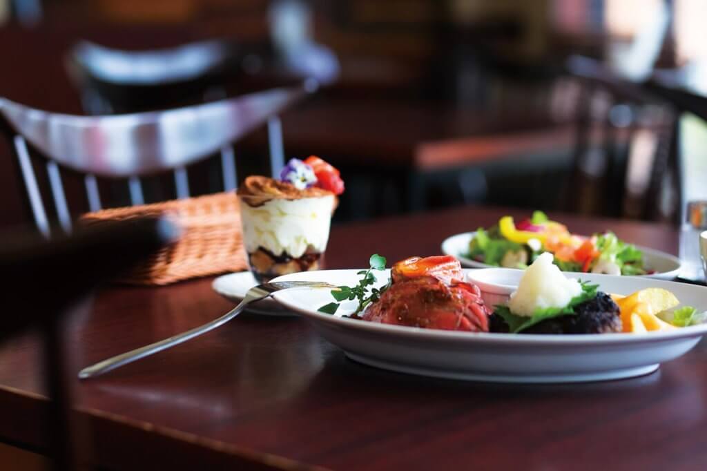本格グリル&ロースト料理が自慢のカフェダイニング。こちらからは、人気ナンバーワンメニューのローストビーフ丼と、女性に人気のおろしハンバーグがセットになった贅沢なワンプレートが登場。プレートにはフライドポテトにたっぷりチーズがかかったチーズフライも付き、子どもから大人まで大好きな味が大渋滞。その上、デザートには華やかなティラミスを、そして、通常ランチでは提供していないハーフサラダもセットになった豪華版。広々とした店内で、ボリューム満点のお肉料理に満たされてください。