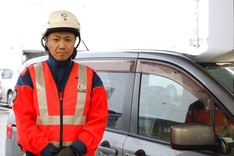 教えてくれたのは、佐藤明人(さとう・あきひと)さん。ロードサービス隊新潟基地所属。JAF隊員歴10年。爽やかさとたくましさを兼ね備えたお手本のようなJAF隊員さんです。