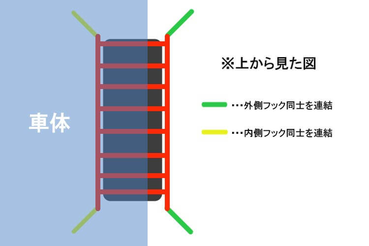 ハシゴ型チェーンの連結部分はタイヤ内側(内側フックで連結)とタイヤ外側 (外側フックで連結)の2か所。これから連結する箇所をしっかりと確認し、作業がしやすいように配置します。