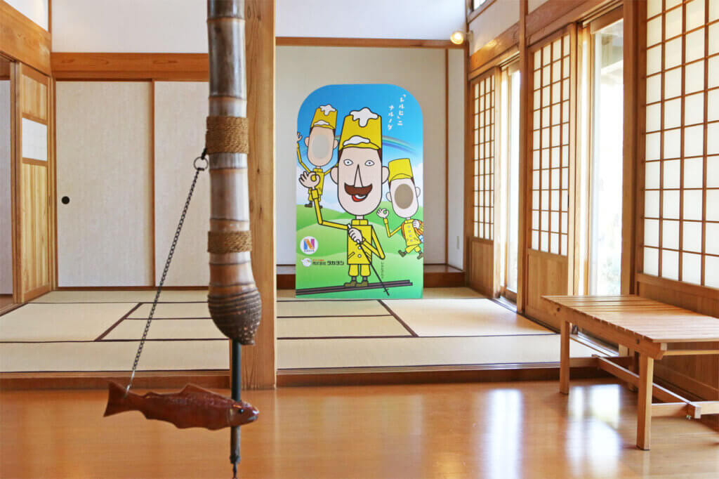 入り口直結の床の間に入ると、レルヒさんの顔出しパネルが出迎えてくれました! 家主の「ヨウコソ」の声がどこからか響いてくるようです(笑)。