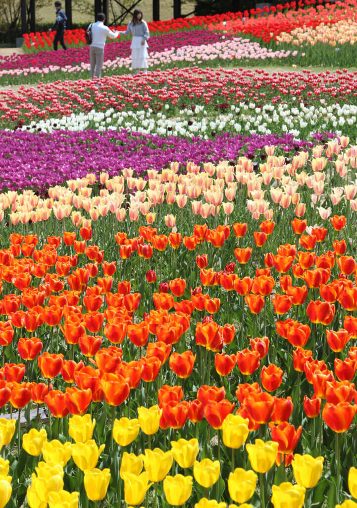 道中のチューリップ畑も満開。はっとするような絶景をぜひお見逃しなく。