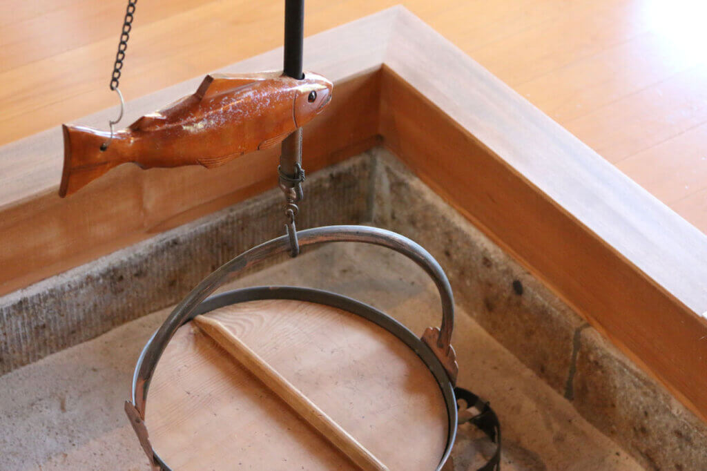 雰囲気のある囲炉裏も。鮮魚センター「マリーン」で調達した鮮魚と地酒で毎晩楽しんでいるのかな? レルヒ家のホムパ、招かれたい!