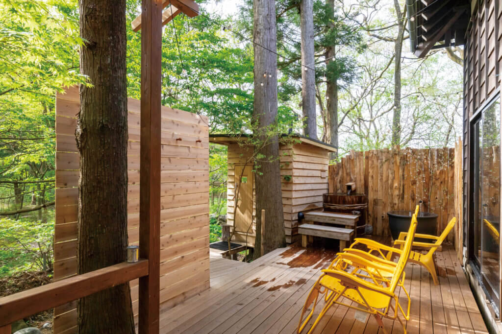 緑に囲まれた外気浴スペースには、吉清水の水風呂のほか、小さな風呂も。水風呂は通年11℃と低めの水温ながら、やわらかな肌当たりで心地良くととのえてくれます。