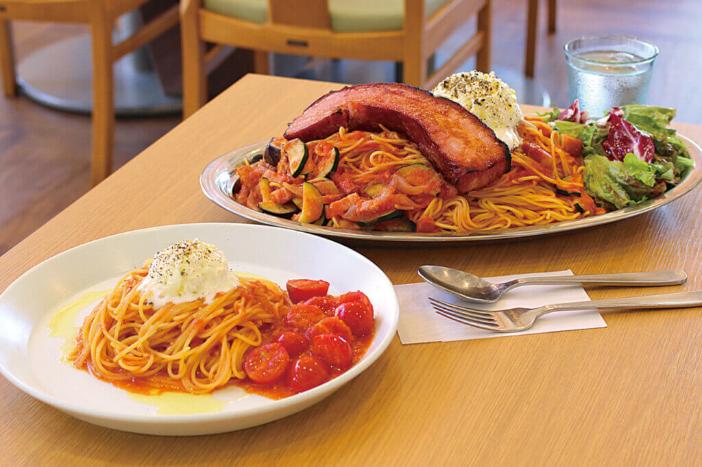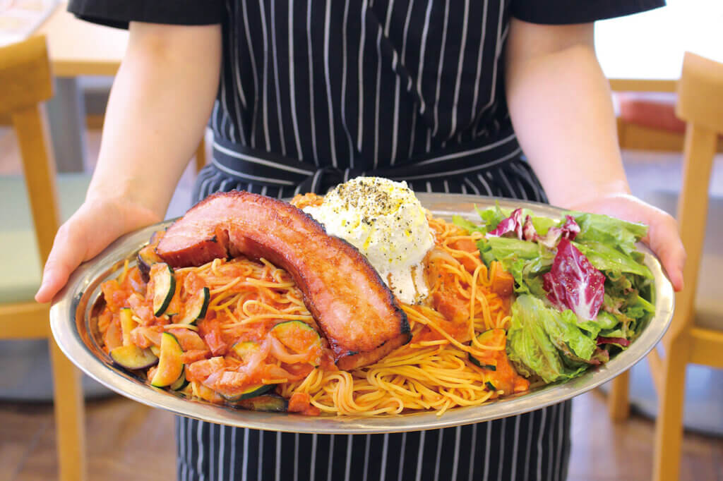 「パスタとピザの店 base(バーゼ)」が提供する『保内古墳パスタ』は、保内地区の「保内三王山古墳群」をテーマに、4人前のパスタを使用した総重量2キロを超えるメニュー。