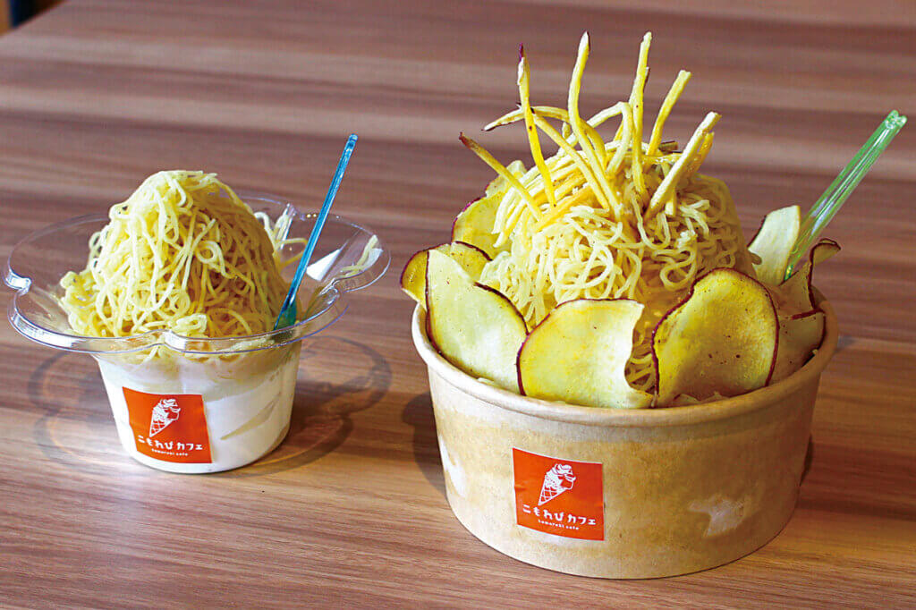 「こもれびカフェ」が提供するのは、下田産サツマイモを使った人気パフェ「さつまいモンブランソフト」の約2倍のボリュームの「さつまいモンブランソフト マシマシ」。