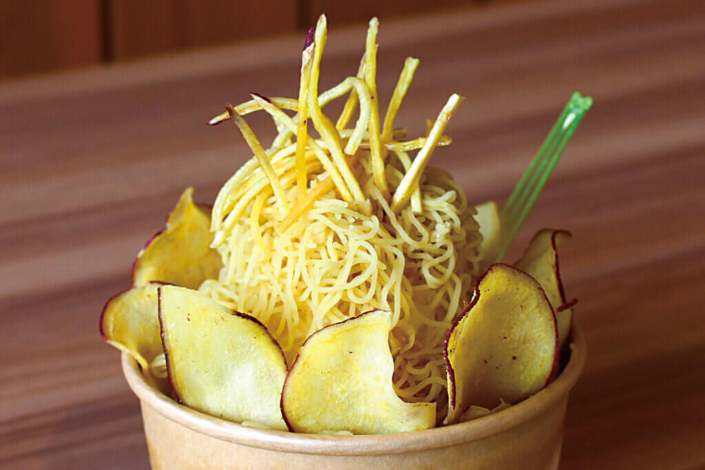 サツマイモチップや芋けんぴがトッピングされた、見た目もユニークなメニューです。