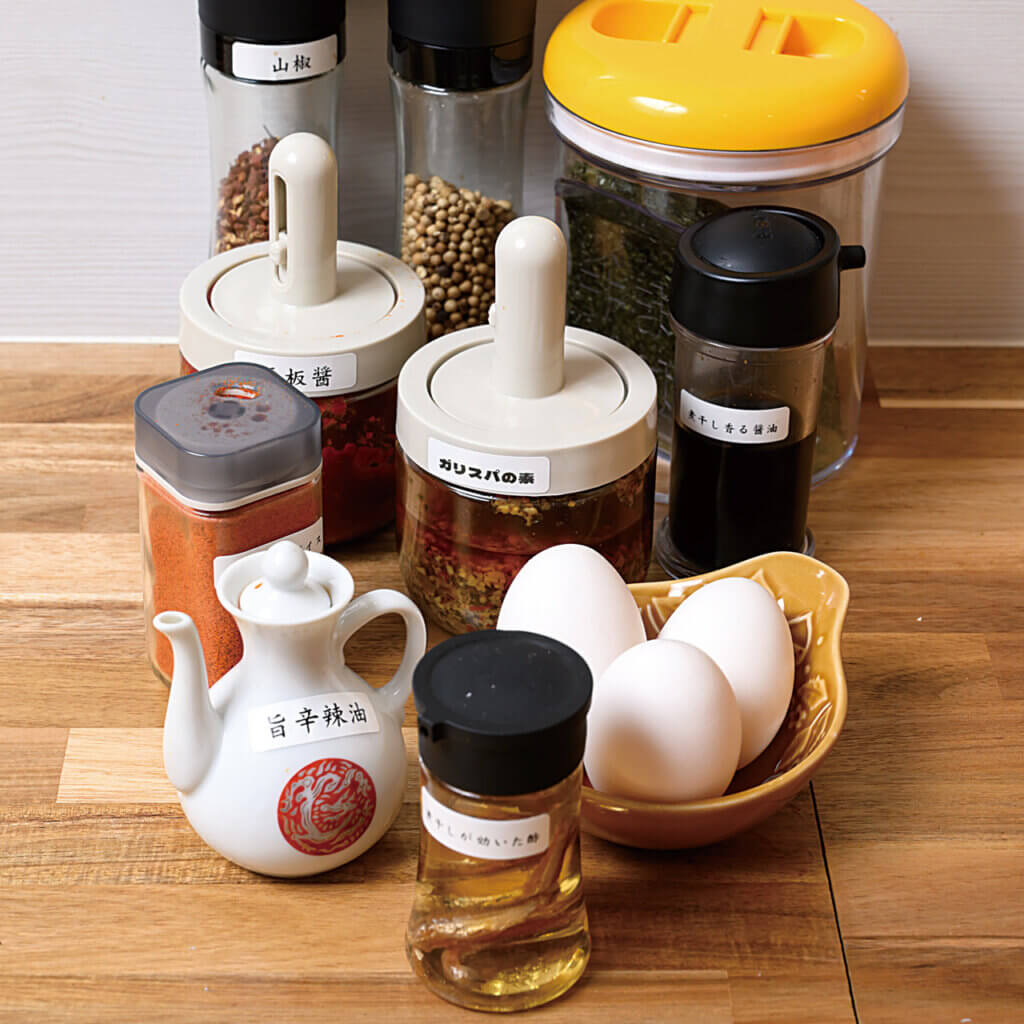 10種類の卓上調味料で、自分好みにカスタマイズを楽しんで。1杯無料のライスが付いているので、生卵と卓上スパイスでオリジナルTKGにすることもできます。