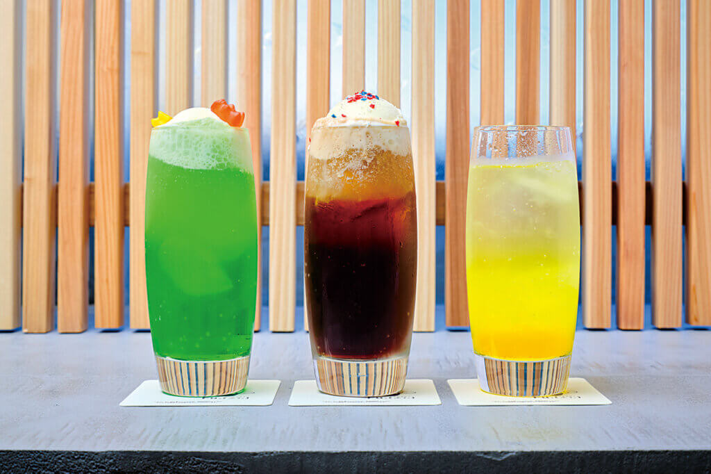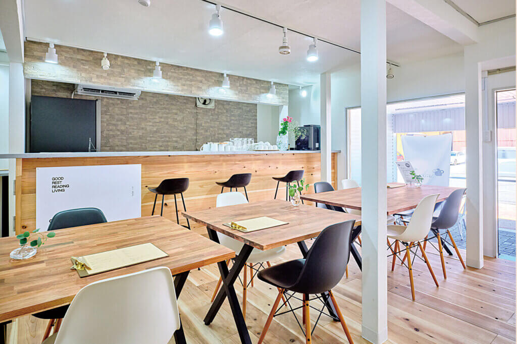 セルフリノベーションで完成した木のぬくもりあふれる店内は、居心地の良さが魅力。カフェスペースにはカウンターやテラス席もあり、名作をイメージした色鮮やかなドリンクを注文できます。