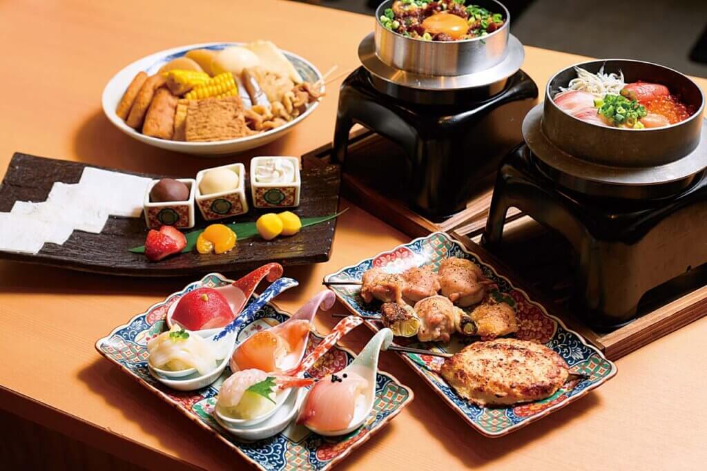 テーブルで仕上げる釜飯(1,353円〜)やごろっとした焼鳥(275円〜)、見た目も美しいレンゲ寿司(1,353円)、自分で包むフルーツ大福(913円)など遊び心のあるラインアップ。