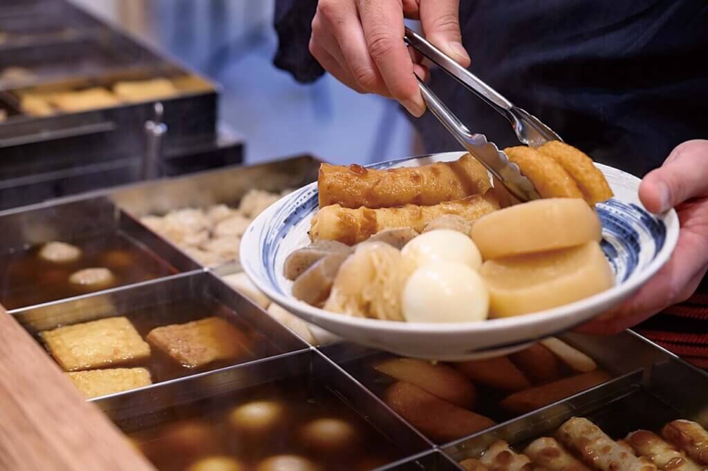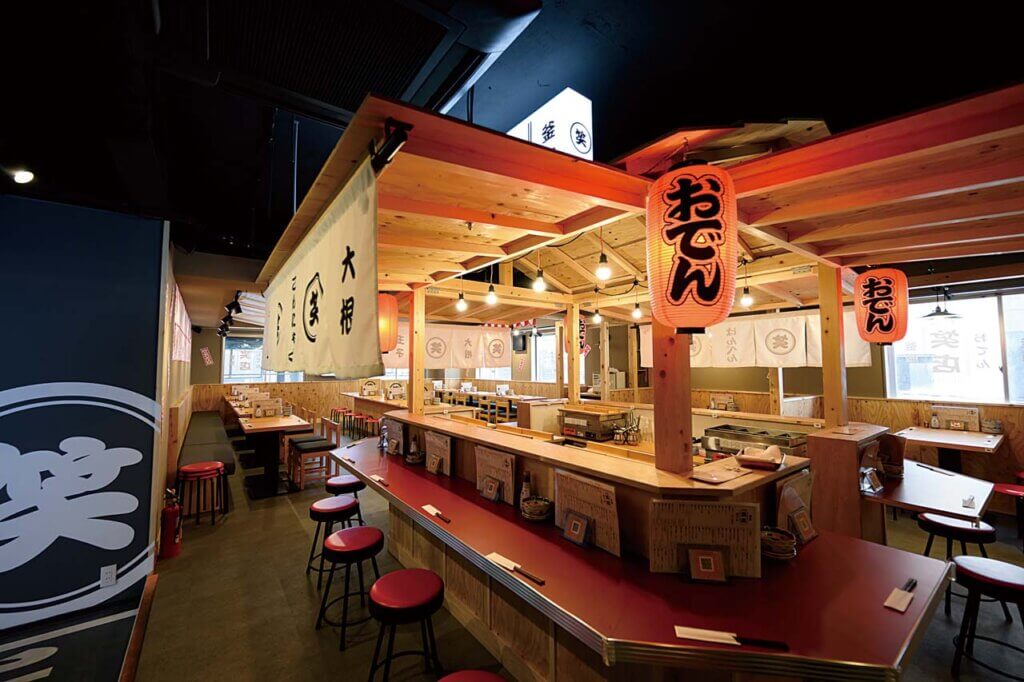 店内の中央にはライブ感あふれる屋台が鎮座し、空いた皿を持っていけば鶏だしの染みたおでんをおかわりできます。ほかおちょこが選べるサービスも人気。年代を問わずお祭り気分になれて、おなかも心も満足できそうです。