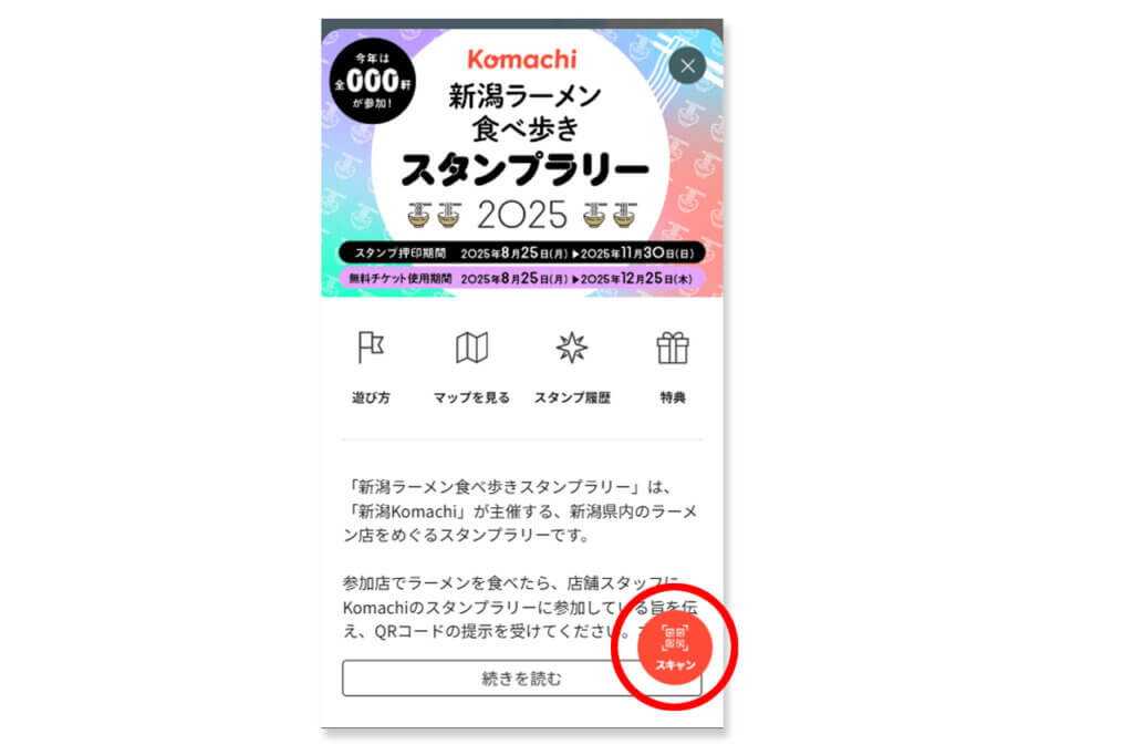 提示を受けたら、スタンプラリーページ右下にある「スキャン」ボタンからバーコードリーダーを立ち上げ、QRコードを読み取ります。