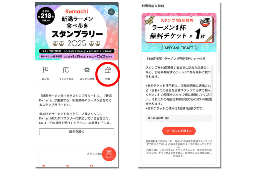 獲得した無料チケットは「特典」タブから使うことができます。