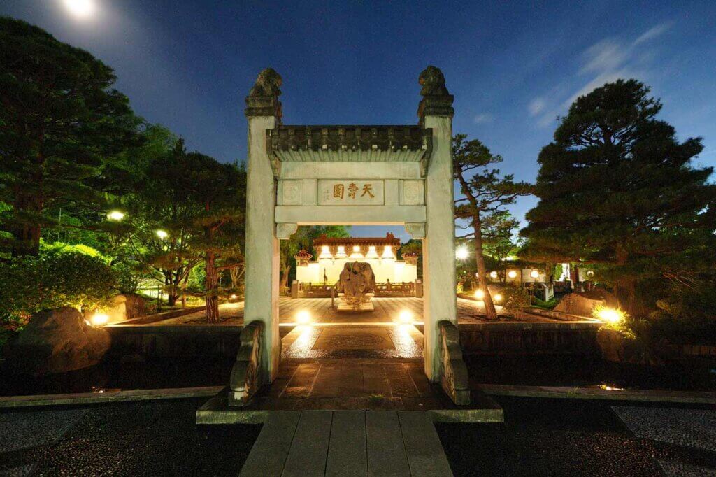 中国から資材を運び造られた中国庭園と、四季折々の風情がある伝統的な日本庭園を併設する「新潟市天寿園」。7月と8月の2カ月間、庭園が幻想的にライトアップされます。