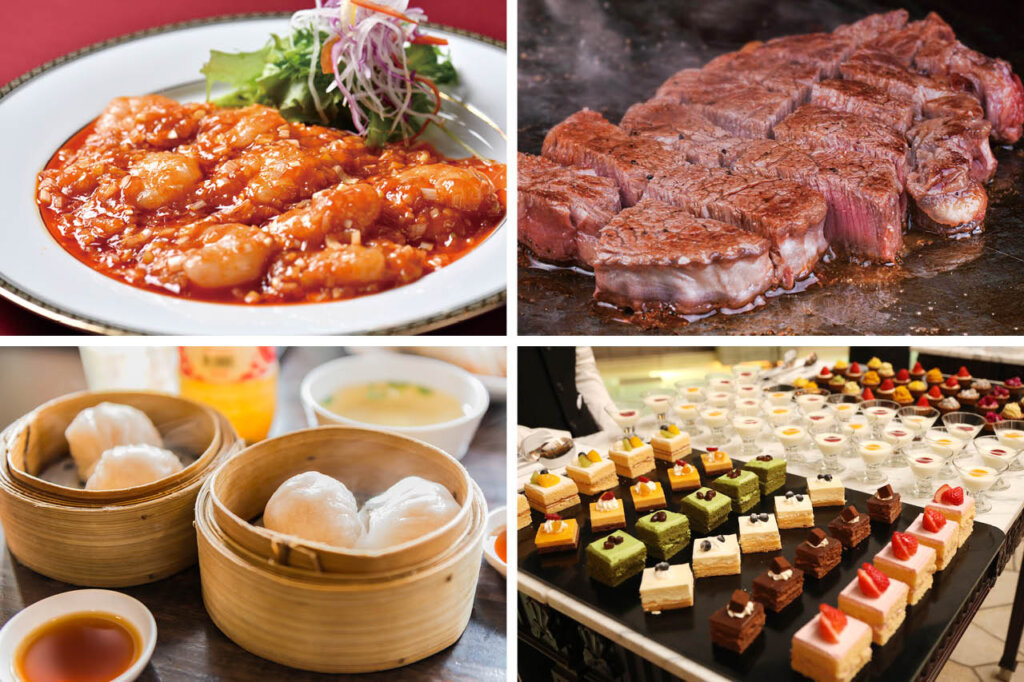 昼はエビのチリソース、夜はサーロインステーキが登場。そのほか、にぎり寿司、スモークサーモン レモン添え、伝統のボロニア風ミートソーススパゲッティ、点心盛合わせなど、豪華なメニューがずらり。アイスやプティフールなど、デザートもラインアップ。好きなものを好きなだけ味わえるので、家族で楽しいひとときを過ごすのにぴったりです。