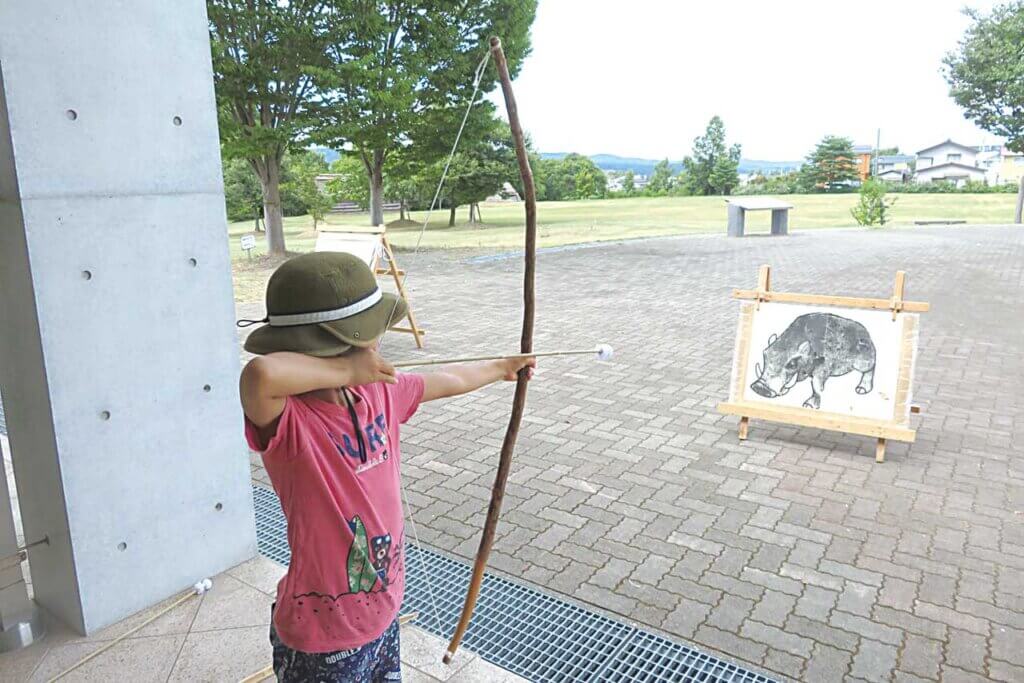 8月12日(火)は「弓矢で狩り体験」、13日(水)は「縄文首飾りづくり」、14日(木)は「縄文の森・木工クラフト」を行います。