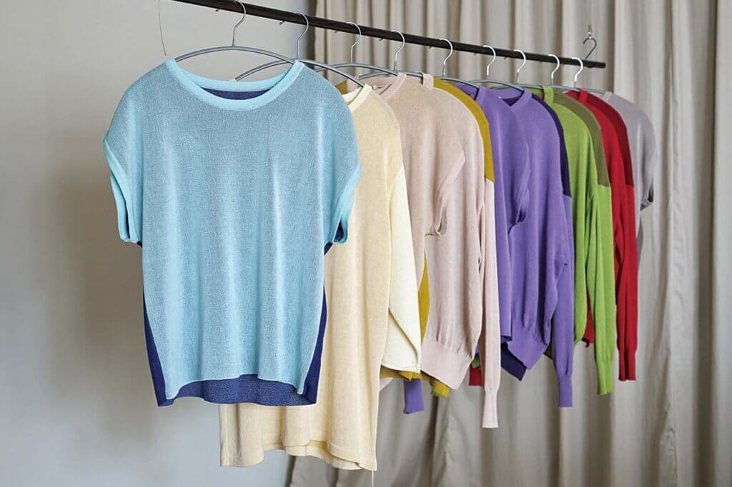 五泉ニットの春夏コレクション。天然素材である綿の特性を生かした、着心地の良い涼やかな一着が並びます。
