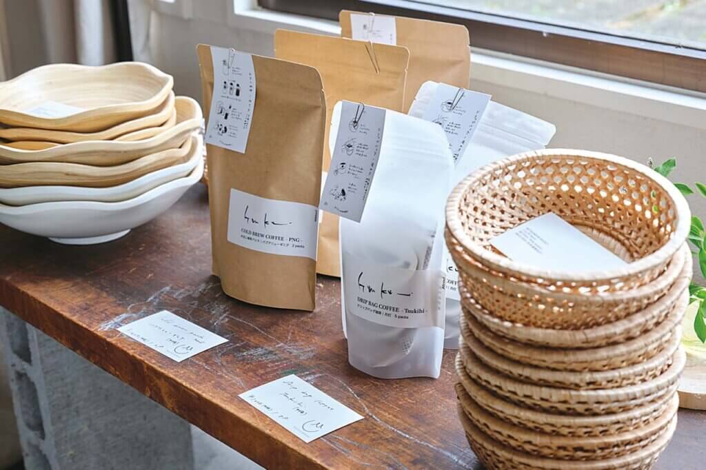 六つ目編みのかご(550円〜)や三条市「原型」のコーヒー豆なども販売しています。