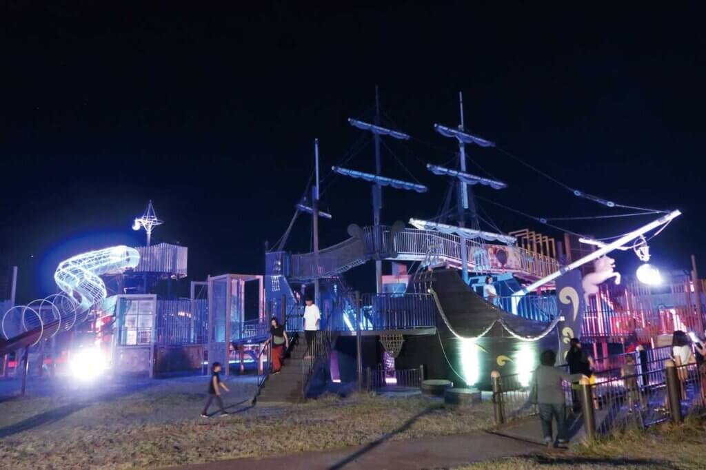 信濃川河口と日本海を望む場所にあり、帆船を模した大型複合遊具やローラー滑り台など、たくさんの遊具を備える公園「山の下みなとランド」を夜間開放。ライトアップされた幻想的な公園で遊ぶことができます。また、ワークショップやステージイベント、キッチンカーの出店も。当日は「山の下みなとタワー」も開放されますので、信濃川河口の夜景も楽しめます。