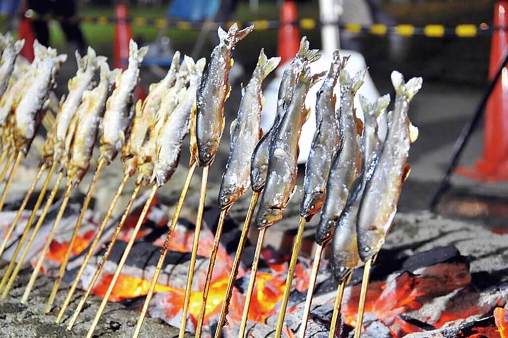 長さ20メートルの焼き場に、鮎の塩焼きがずらり。焼きたてを味わえるほか、郷土料理や地酒の販売ブース、ステージショーも実施予定。