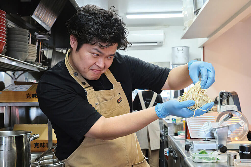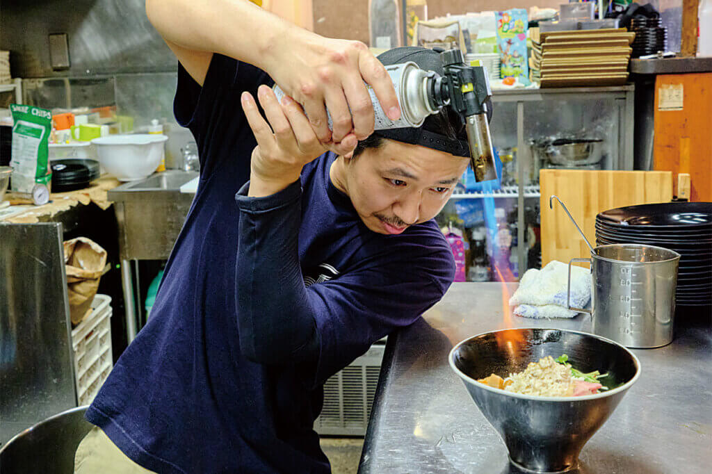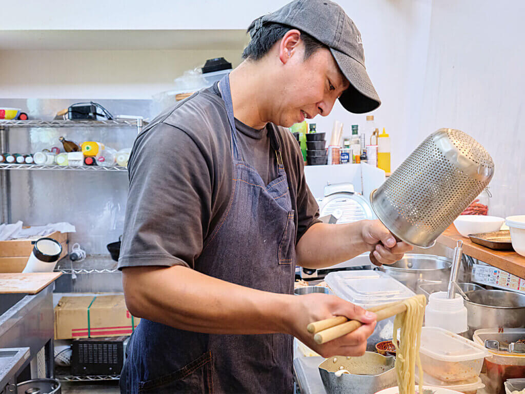 「素材の味を表現しやすい」と長江さんが評する油そば。その言葉通り、今回は夏野菜のトマトを使ったナポリタン風油そばを考案してくれた。ケチャップとバジルを麺にあえ、ニンニクやタマネギたっぷりのトマトペーストと煮干し油、魚粉を加えることで、酸味にうま味と香りをプラス。タピオカ粉入りの自家製太麺はもちもちで、タレとの絡みも抜群だ。