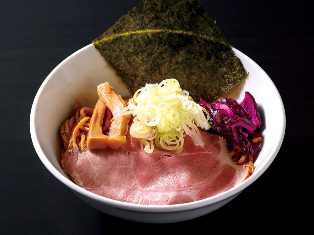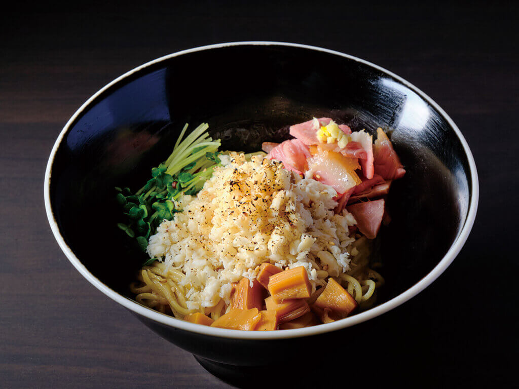 食感が心地良いしば漬けや大判のレアチャーシューが脇を固め、トッピングのチーズ(100円)やマヨネーズ(100円)を入れれば、ナポリタン感がさらにアップする。