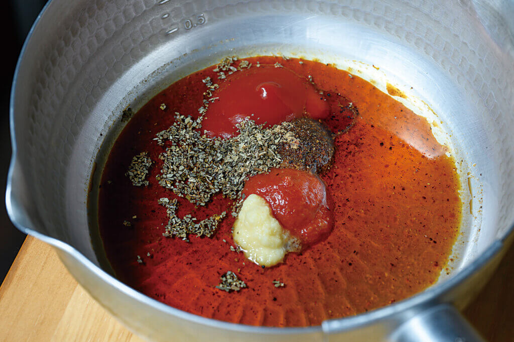 手鍋にケチャップやタレ、油などの調味料と麺を入れ、加熱しながら混ぜていく。油が乳化することで味が均一になり、より濃厚な味わいに。