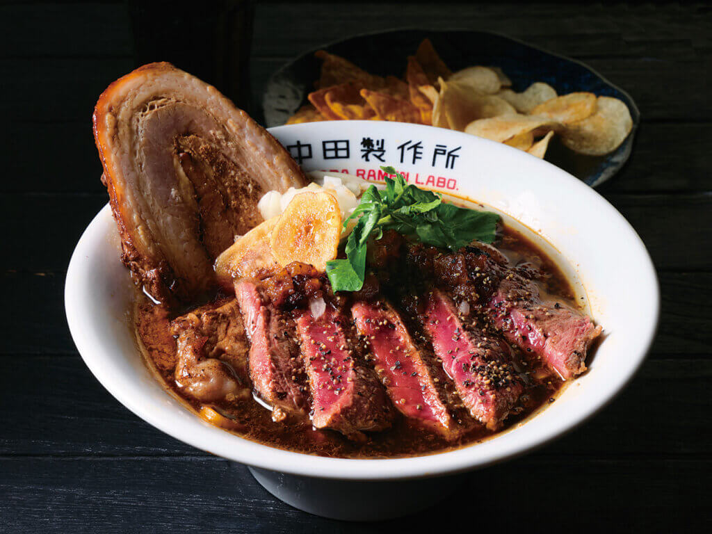 具材の目玉は、まぜそばに使うニンニク入りの背脂で焼いた150グラムのサーロインステーキと厚切りの豚バラ肉。お供として、ポテトチップスとコーラを沿えることでアメリカらしさを表現している。エルヴィスの愛したバナナチップスのトッピングにも注目を!