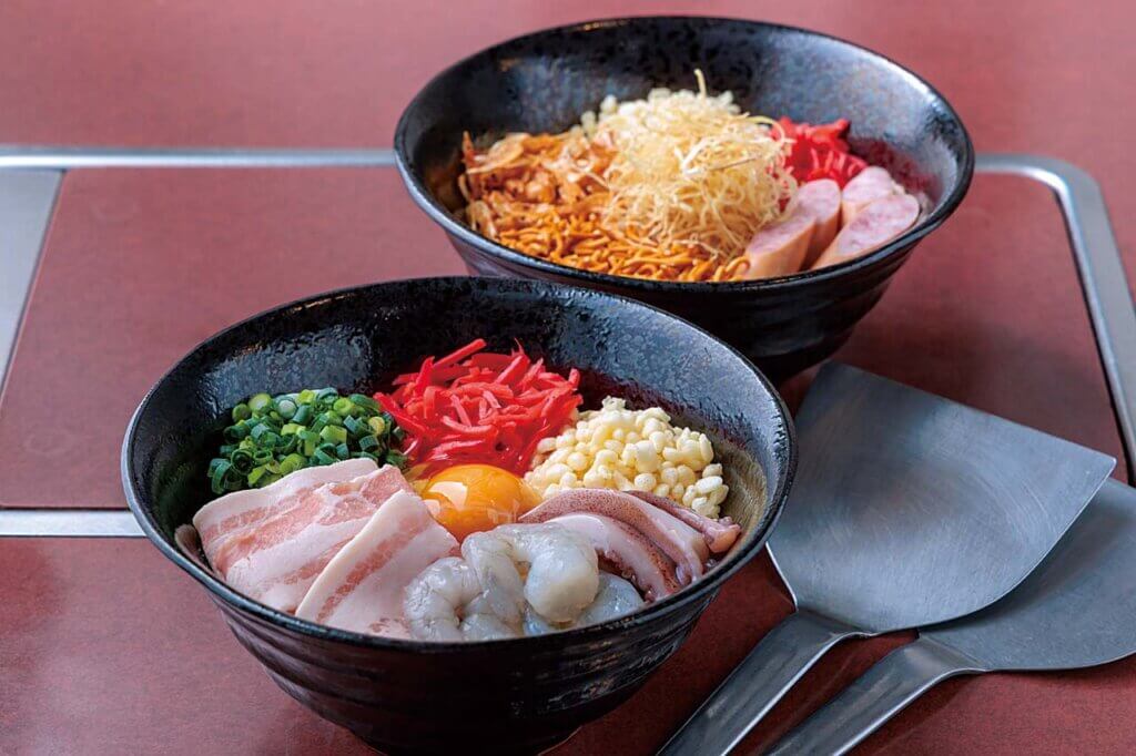 定番ミックス焼き(980円)、定番下町もんじゃ(980円)。