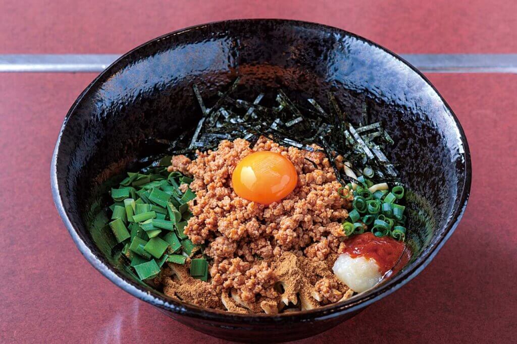 ランチの定番・肉まぜそば(850円)。うま味が凝縮したピリ辛の肉みそが味の決め手です。シメのライス付き。