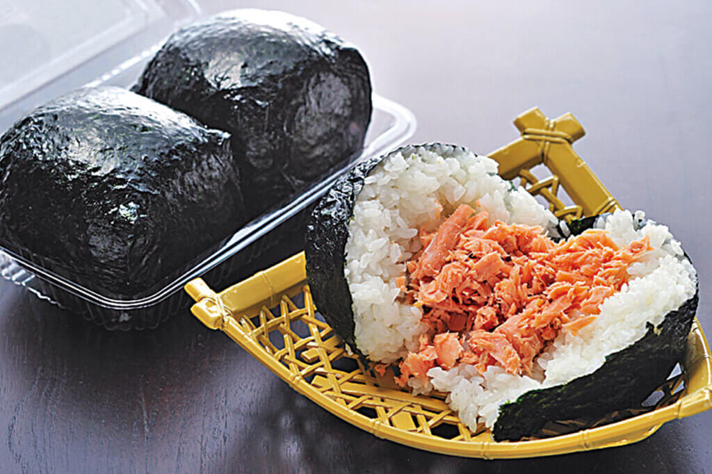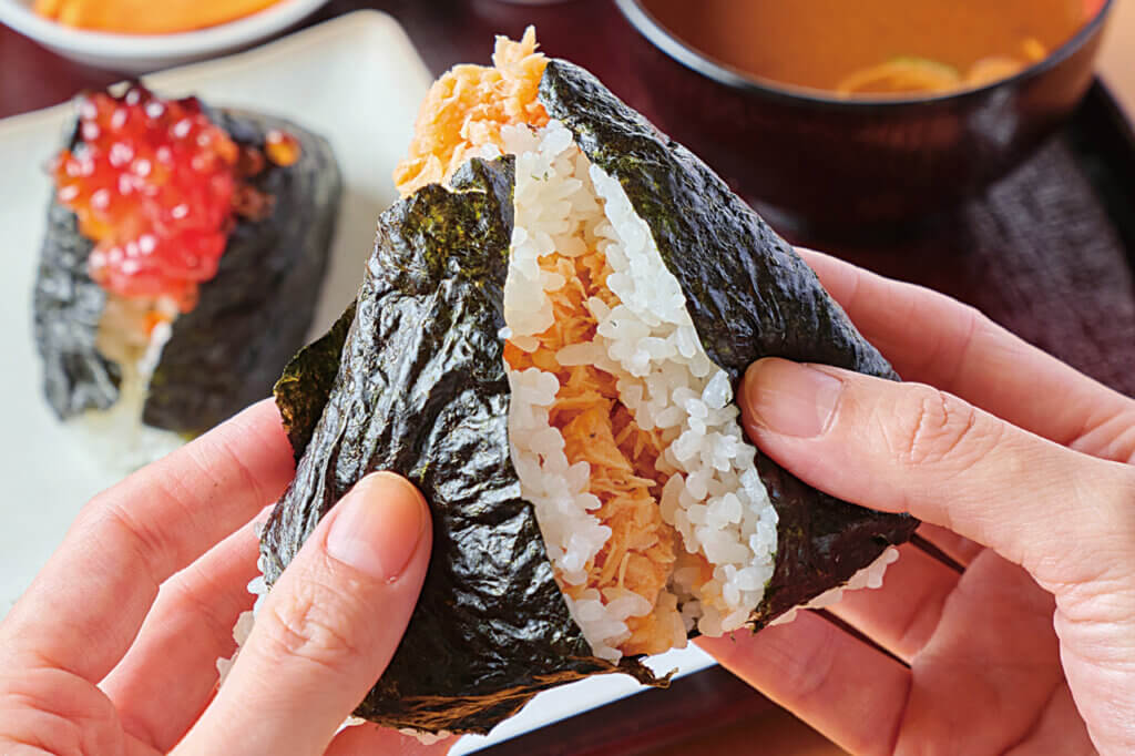 加島屋のロングセラー瓶詰・さけ茶漬と同じキングサーモンを塩のみで味付けし、焼き方、ほぐし方までこだわったさけ焼きほぐし、塩漬けで素材のおいしさが際立つ北海道産塩すじこなど、老舗の美味を凝縮した大きなおにぎりは、頬張った瞬間に笑顔があふれるはず。