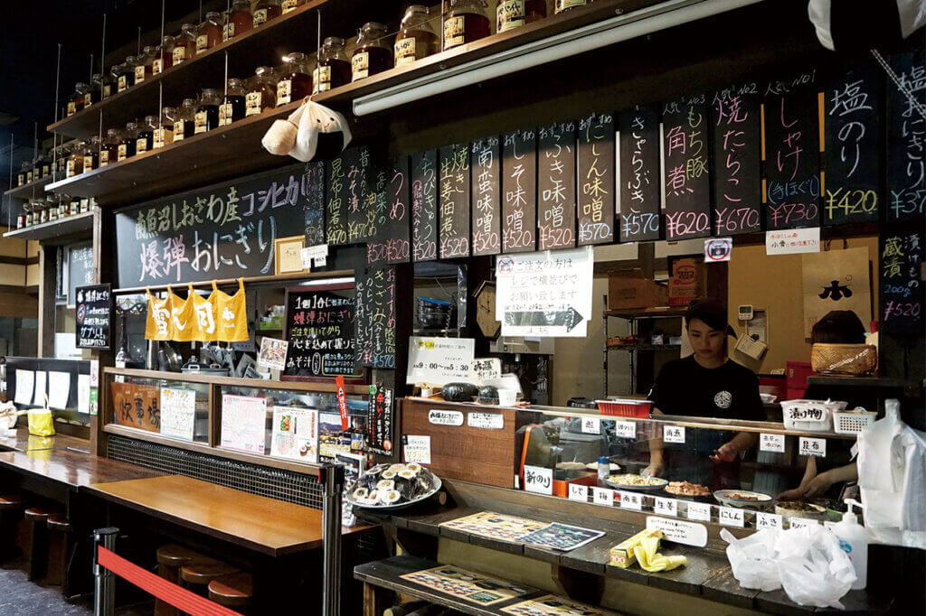 魚沼産コシヒカリを地元の名水「雷電様の水」で炊き上げたお米を使って握るおにぎりが自慢。常時20種類以上そろい、どれもふっくらとした仕上がりで口の中で優しくほぐれるのが特徴。旬の食材を使った個性豊かなメニューにも注目を。