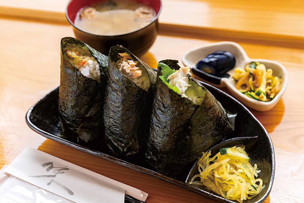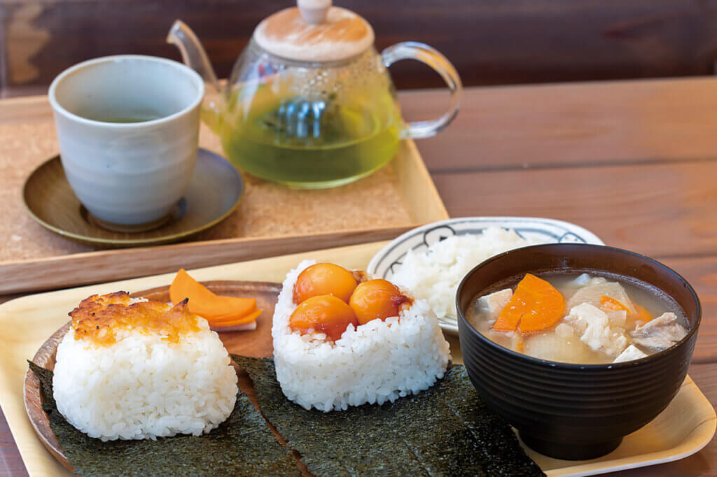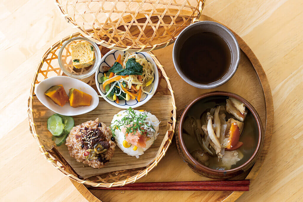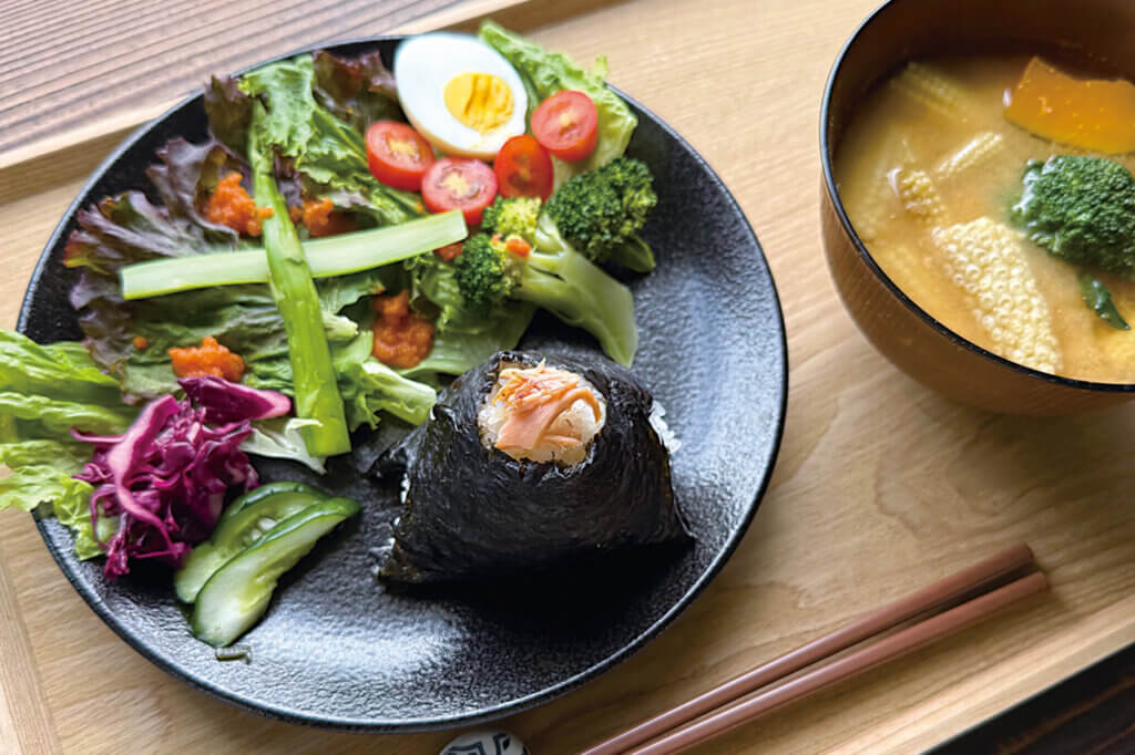 地元農家から仕入れた食材で、健康を意識したメニューを提供。おむすびセットは、栄養満点の酵素玄米や自家製みそなど、体に優しい素材で作ったおにぎりが主役。仕入れに合わせて具材や味付けが変わり、旬を感じられる味わいに。