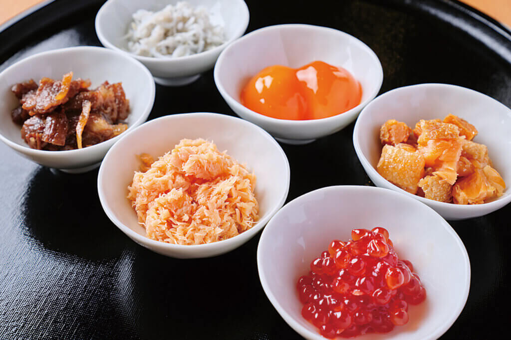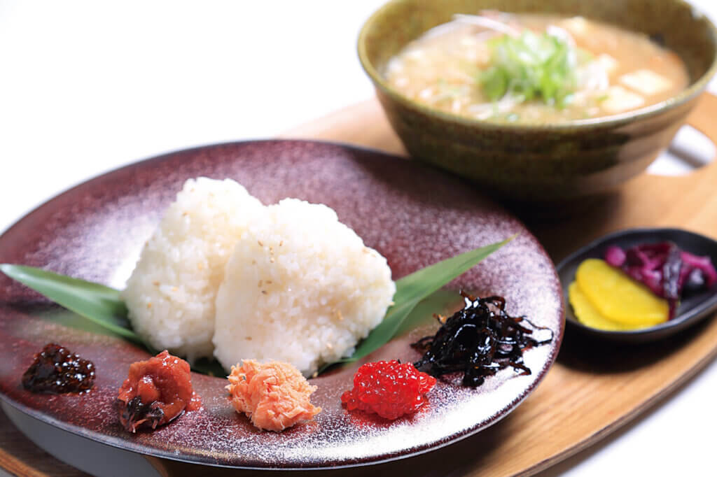「BANDAI FOOD HALL」内のおにぎり食堂。「お米の価値を上げる」をテーマに多彩なおにぎりを提供するこちらでは、この秋から塩むすびを主役にした新たな定食メニューをスタート。塩むすび2個に人気の具材5種が少しずつ並ぶ、贅沢な定食だ。