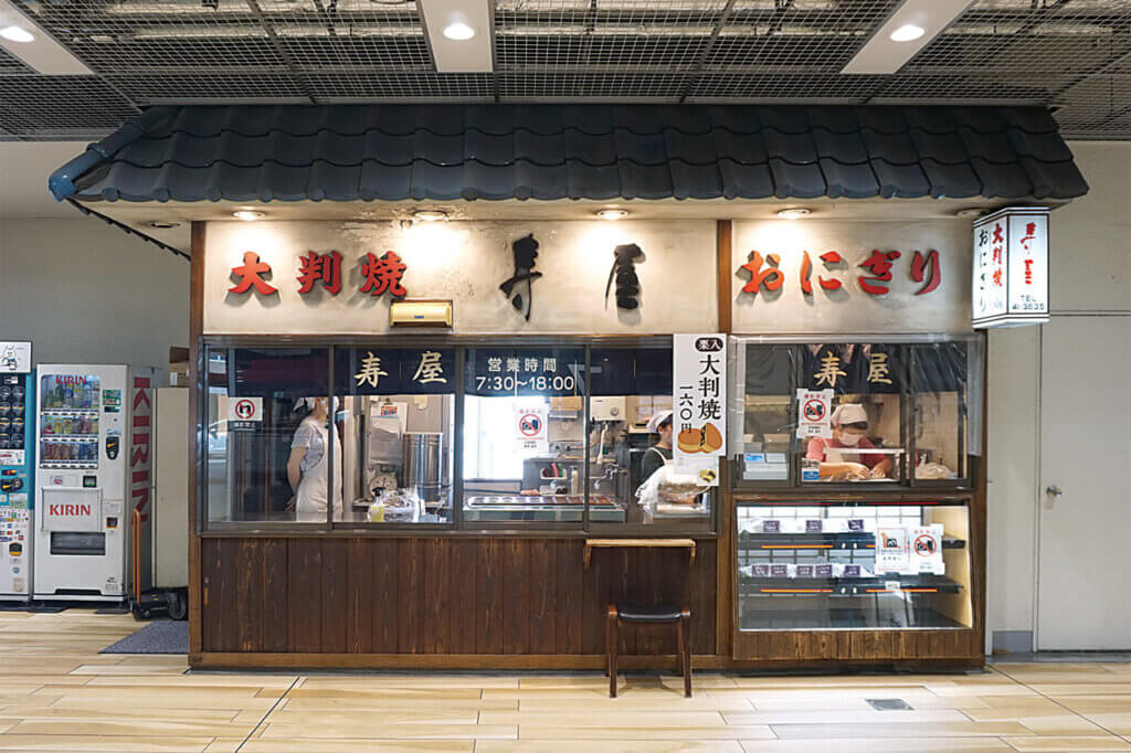 万代シテイバスセンター内で創業40年以上の歴史を持つ、おにぎりと大判焼きの専門店。ご飯はお店で炊いており、鮭やタラコといった具材はすべて店内で仕上げる。通勤前の腹ごしらえやおでかけのおともに購入していく人が多い。