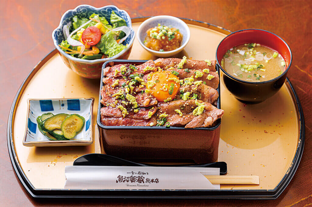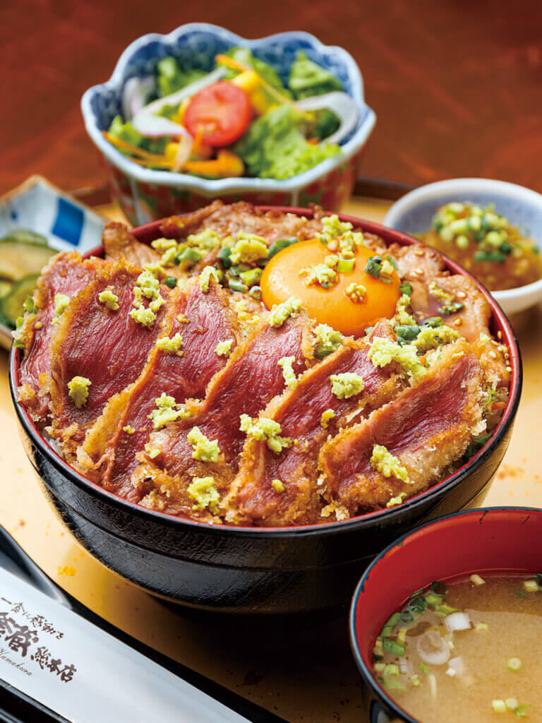 なかでも注目は、特製ダレをまとったサーロインステーキ重。やわらかな肉質からあふれる肉汁とうま味が口いっぱいに押し寄せ、途中でワサビを添えれば、キリリと大人の味わいに。古民家調の落ち着いた空間でゆったりと食事を楽しんで。