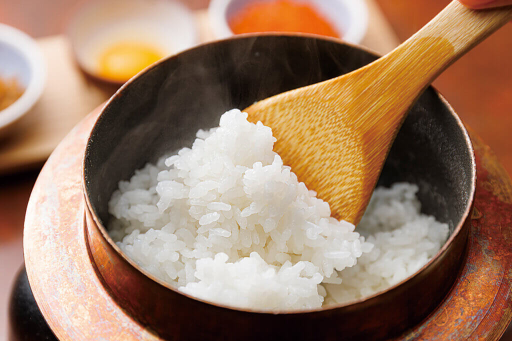 すべての料理を引き立てる南魚沼産コシヒカリは、お米のおいしさを評価する「食味ランキング」で特Aの評価を受けた逸品。大きな羽釜で炊き上げられたつやつやのご飯とジューシーなお肉をほおばる度に幸せが広がり、あっという間に丼の中は空っぽに。