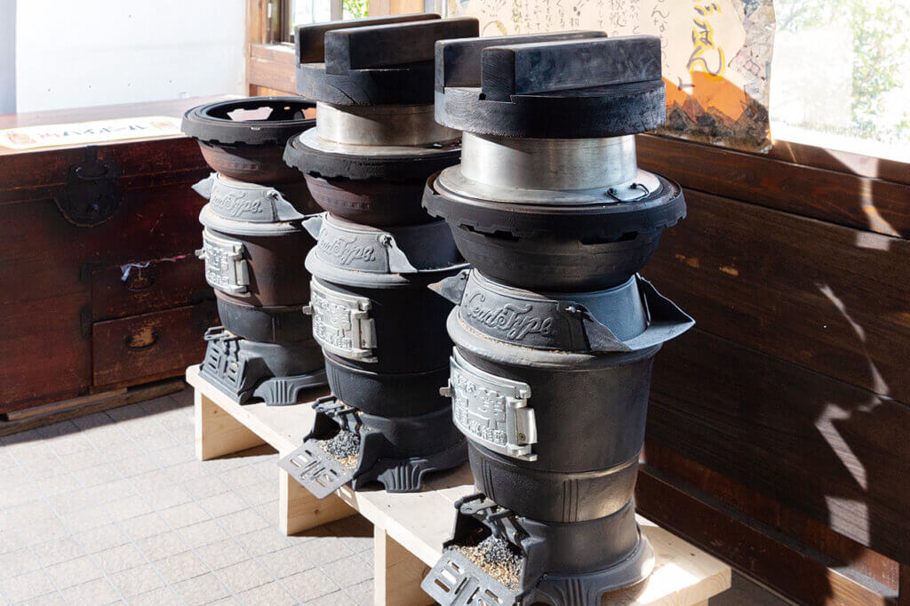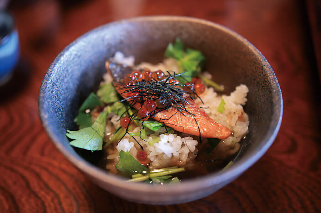土鍋でふっくら炊き上げるご飯は、関川村の米作り名人・奥山政行氏のコシヒカリを使用。なかでも8品から22品までそろう鮭尽くしのコースでは、100種以上あるとされる伝統の鮭料理を、自慢のご飯とともにじっくりと味わえる。