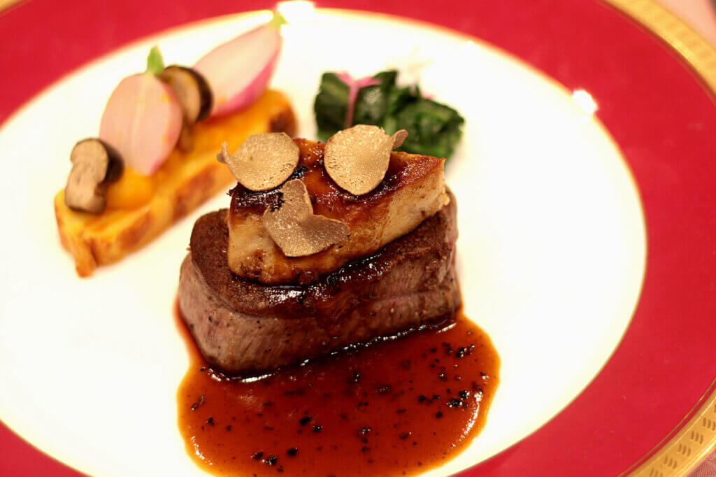 メインの佐渡牛は、芳醇なトリュフソースで。新潟市西区の「すずまさ農園」が手がけるカボチャ「ikkaプレミアム」を使ったミルフィーユの滋味深い味わいとの組み合わせに、秋を感じる一皿です。