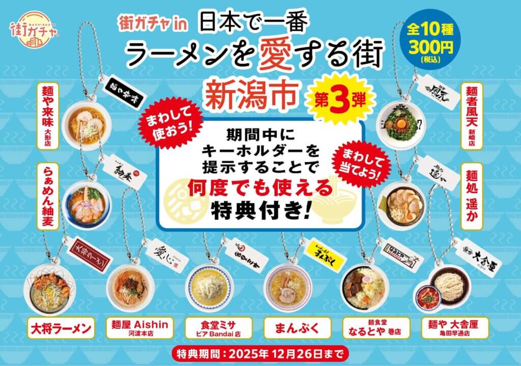 昨年に実施して大好評のうちに終了した「街ガチャ in 日本で一番ラーメンを愛する街 新潟市」の第3弾が、10月14日(火)から新潟市内の観光施設など10カ所で販売がスタートします。